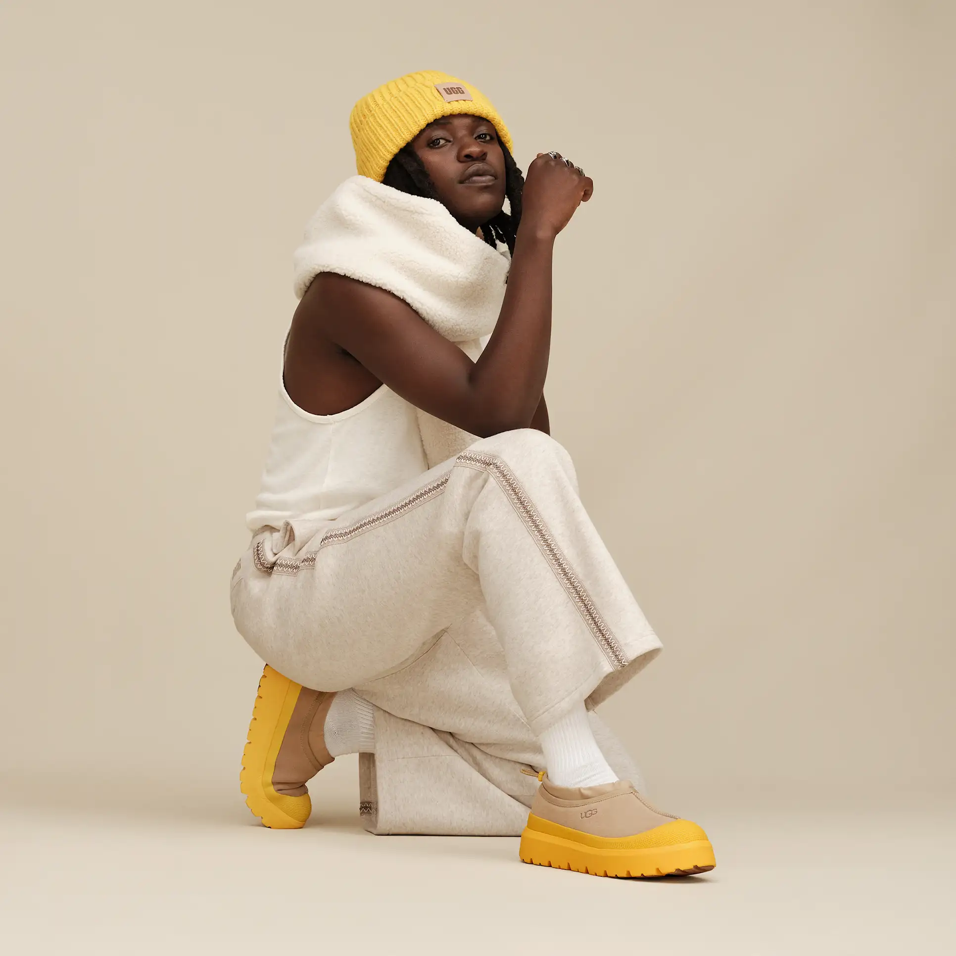 Who (and we can't stress this enough) wants to take a walk in the drizzle with us? We can always count on our Tasman Weather Hybrid to travel with us outdoors, even if its a little wet out there. Featuring waterproof suede and seam-sealed construction as well as our cozy UGGplush™ upcycled wool lining, our Tasman Weather Hybrid offers a light, slipper feel with an easy slip-on silhouette. The outsole is made from renewable, rainwater-nourished sugarcane and features a permanent galosh for wet conditions.